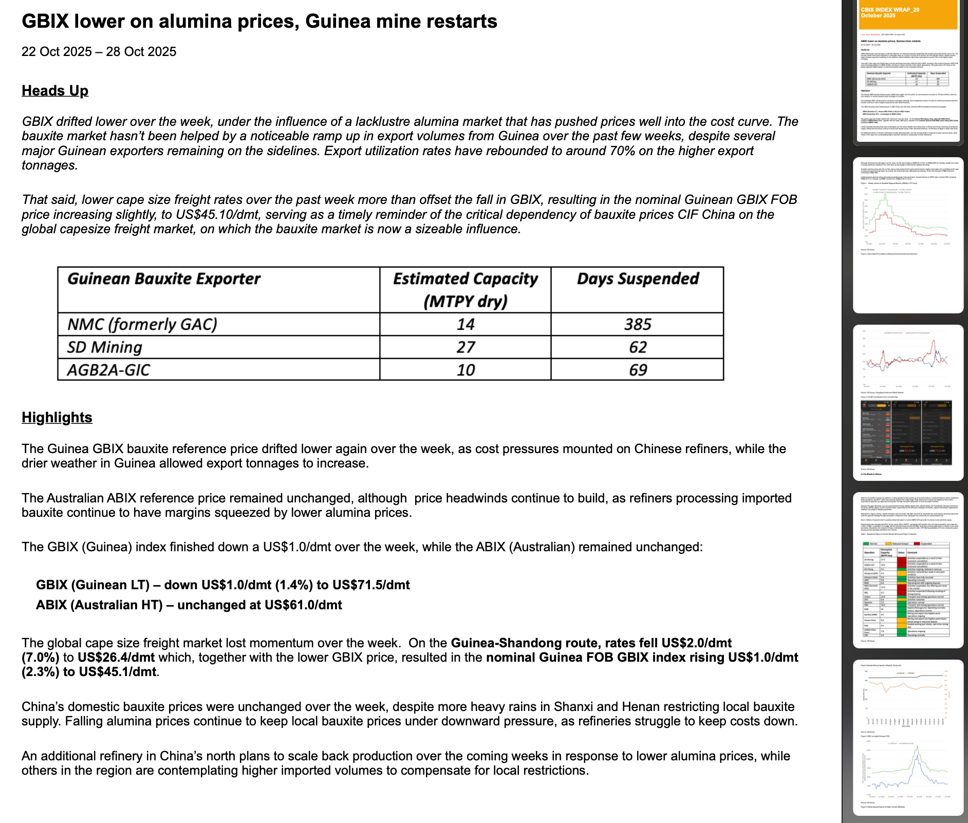 The Bauxite Index builds on over two decades of CM Group’s in-depth market analysis and price assessment, offering the industry’s most trusted view of global bauxite value. First launched as the world’s original Value-in-Use (ViU) adjusted bauxite price index, CBIX, it has since evolved to feature two key benchmarks: ABIX (54% alumina, 9% silica boehmitic bauxite) and GBIX (45% alumina, 3% silica gibbsitic bauxite), reflecting price dynamics across major export hubs such as Australia and Guinea.